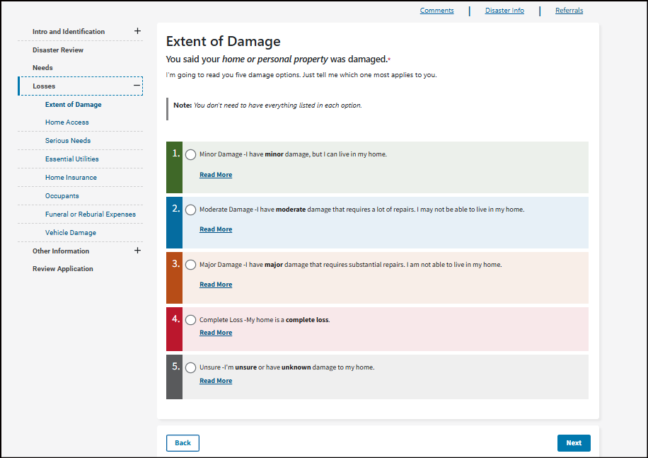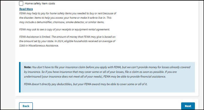 Select what caused your damage. FEMA uses this information to better understand the extent of damage in a community and any damage that needs to be reviewed by your insurance company first.