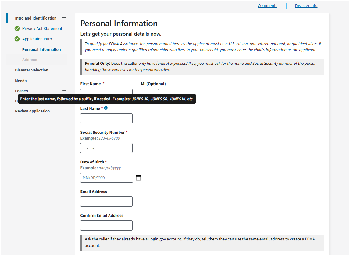 To qualify for FEMA Assistance, the person named here as the applicant must be a U.S. citizen, non-citizen national, or qualified alien. If you need to apply under a qualified minor child who lives in your household, you must enter the child's information as the applicant