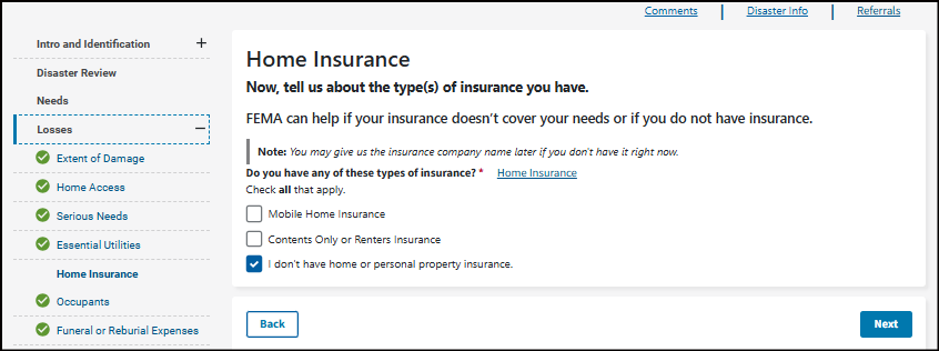 • If you have homeowner's insurance, FEMA may not send an inspector right away. You may need to submit insurance documents before we can schedule an inspection.