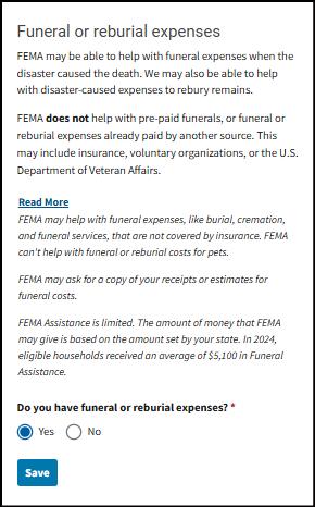 • Other Needs Assistance - This can help with some immediate needs when you can't live in your home. It may cover certain losses and expenses caused by the disaster. Things like personal property and vehicle losses; medical, dental, child care, moving and storage, and funeral expenses."
