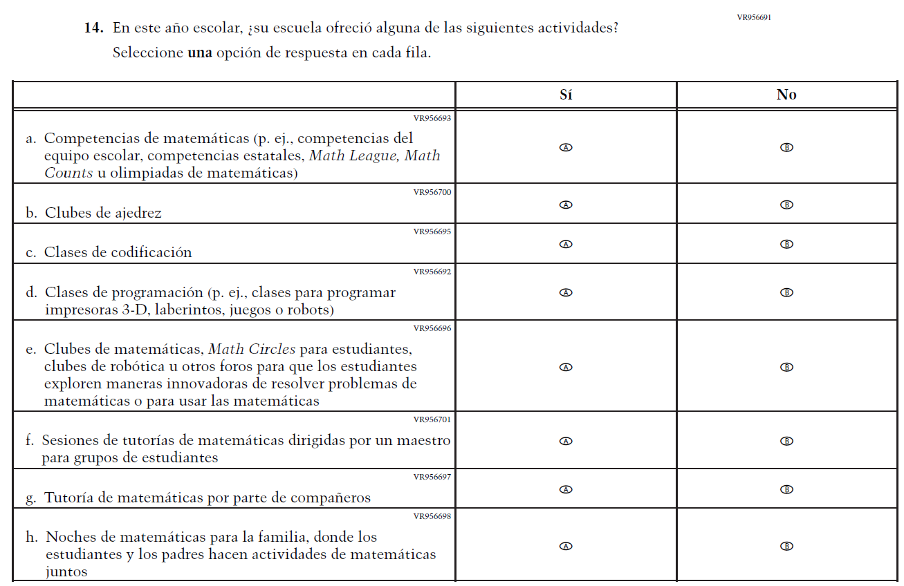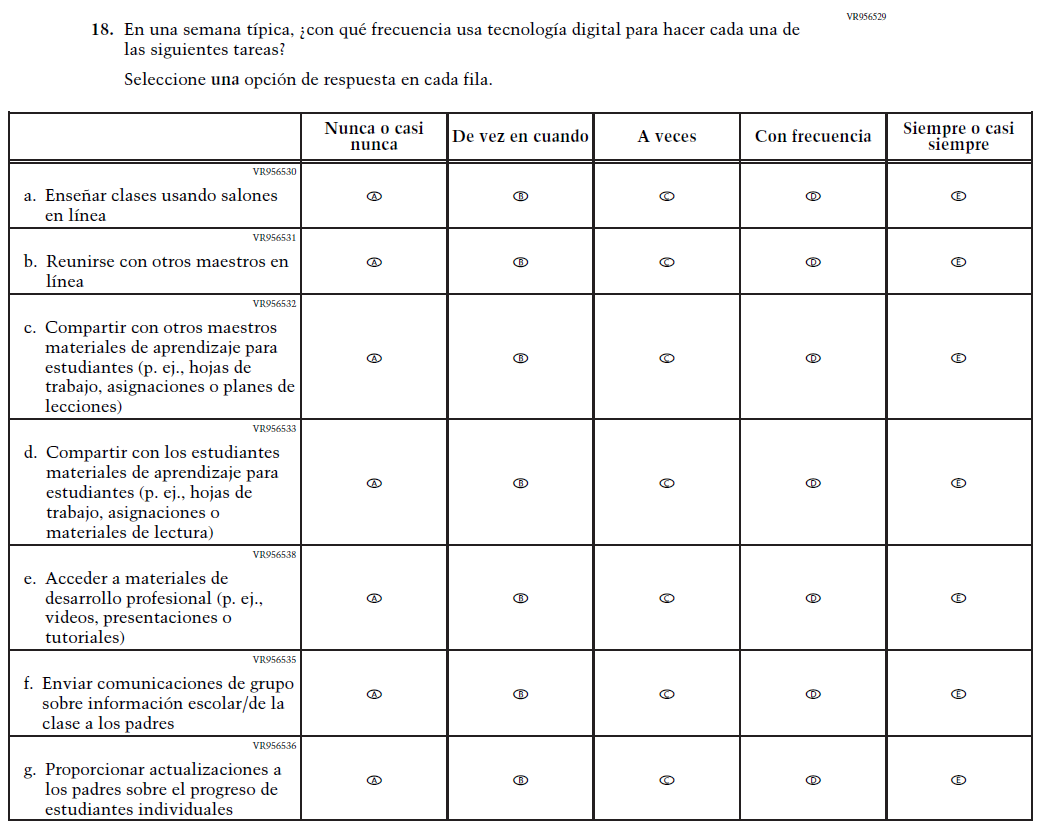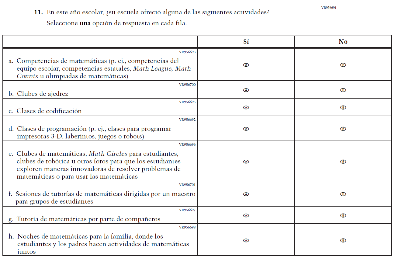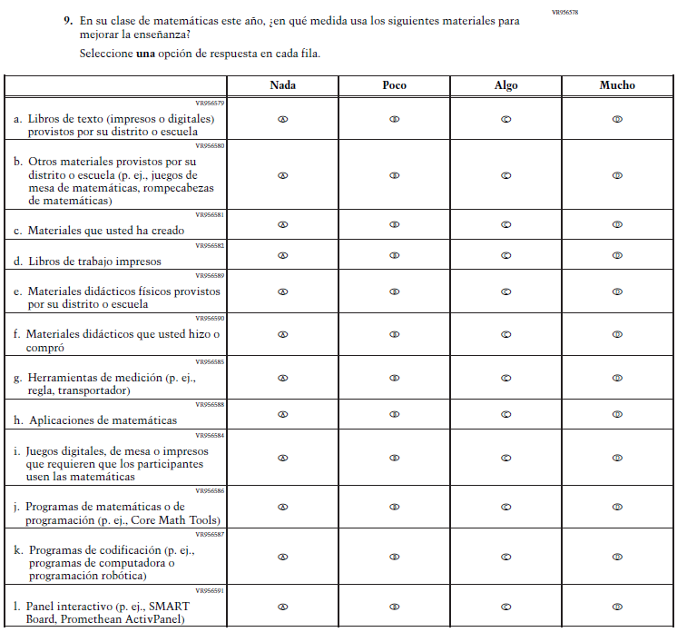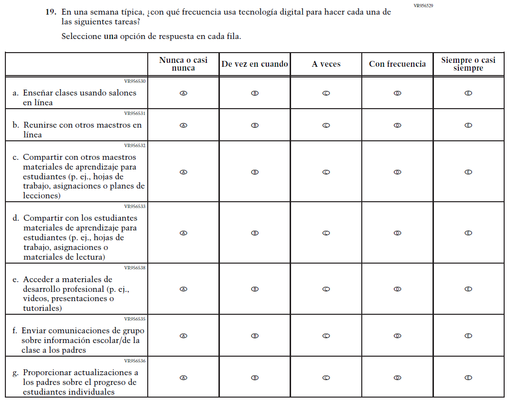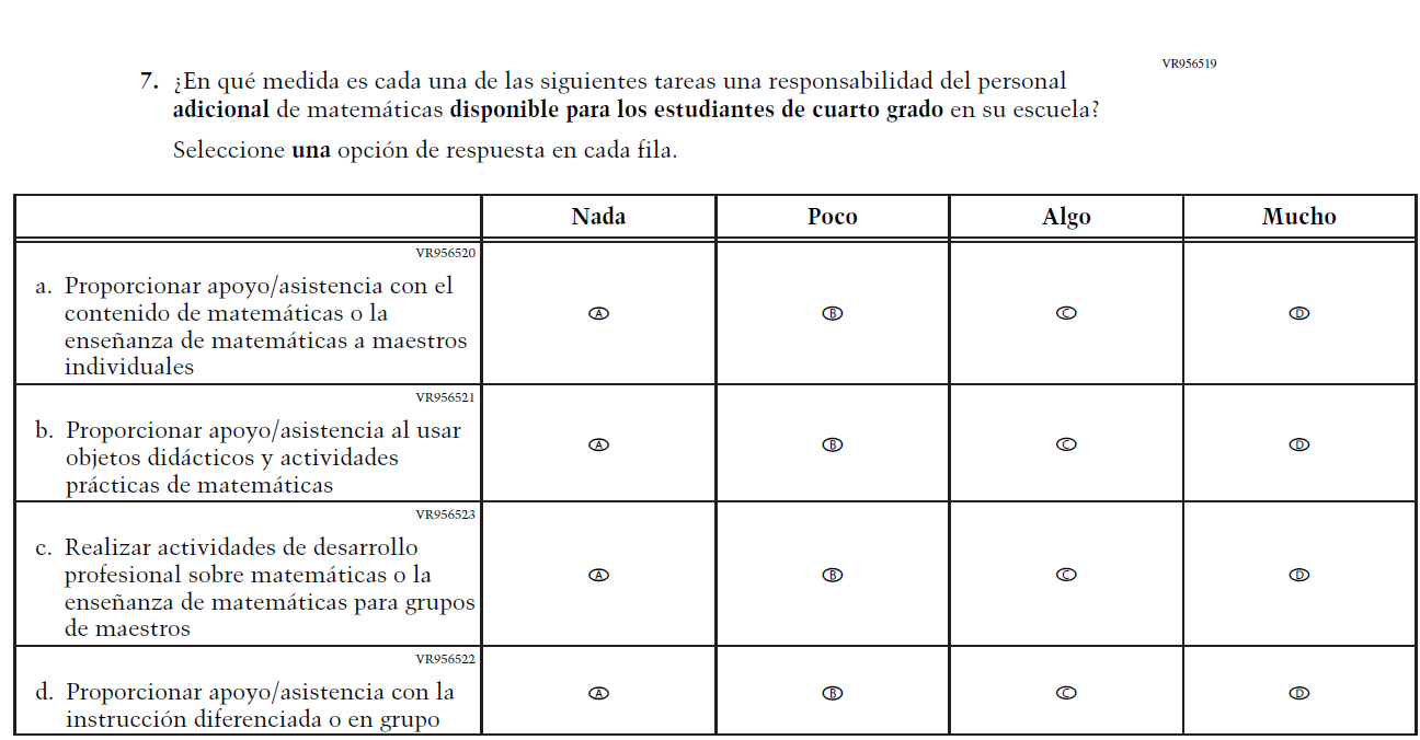 Appendix J-S provides Operational and Pilot Spanish student, teacher, and school survey questionnaires that will be administered in 2026. Summary tables reflect any changes to the items from the 2024 administration. Please note, some of the numbers of the items may be missing or out of order in these printed versions. This will be corrected in the platform view.