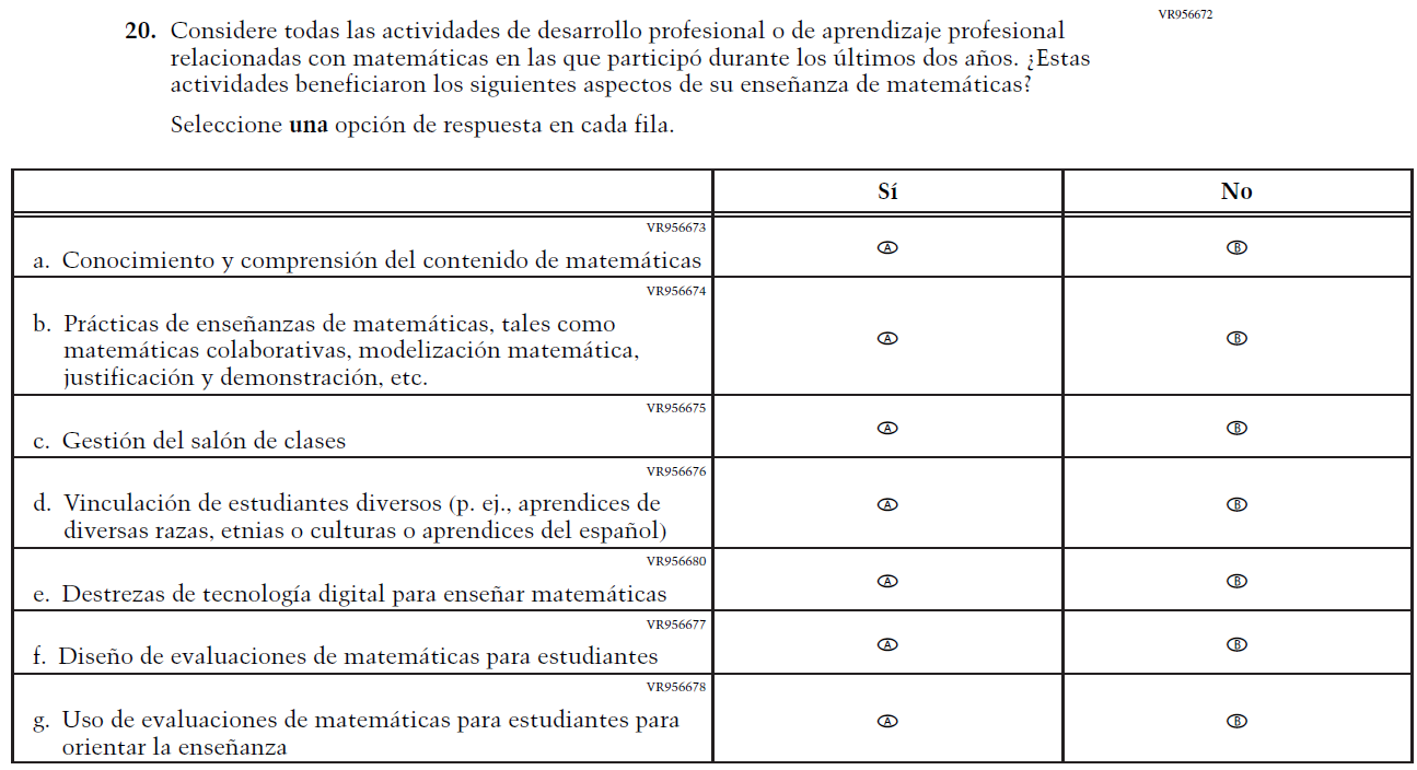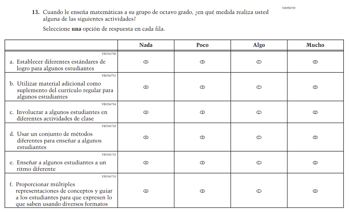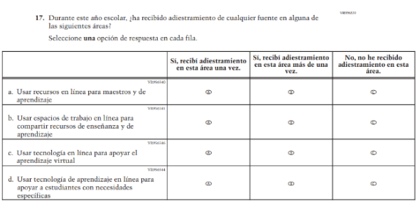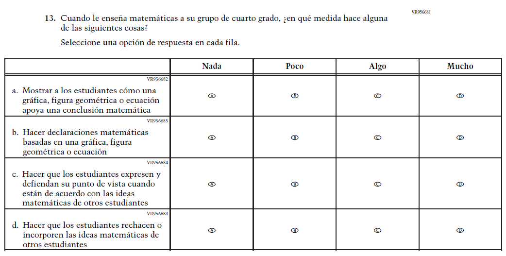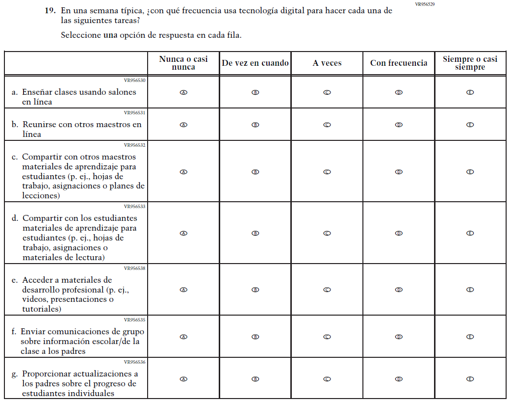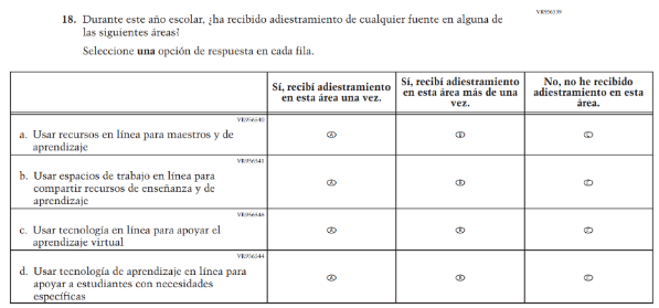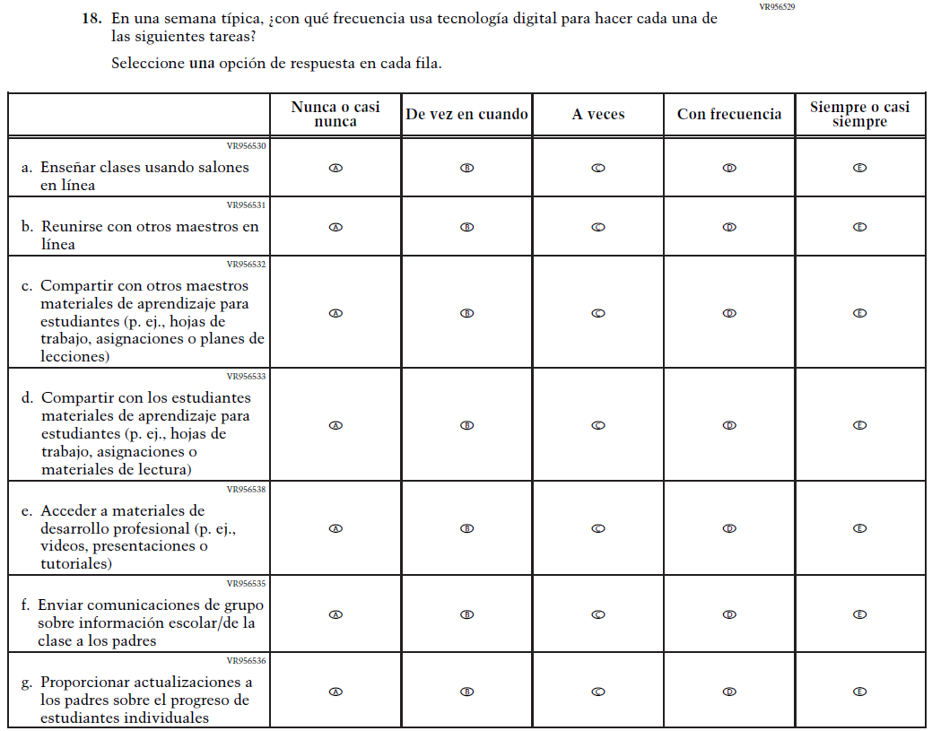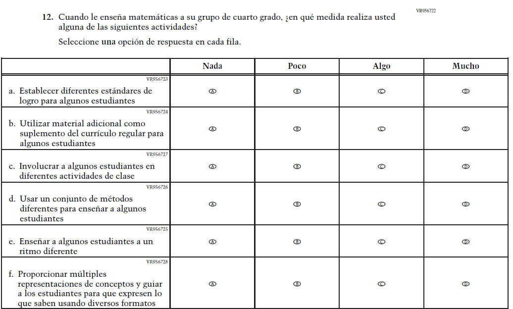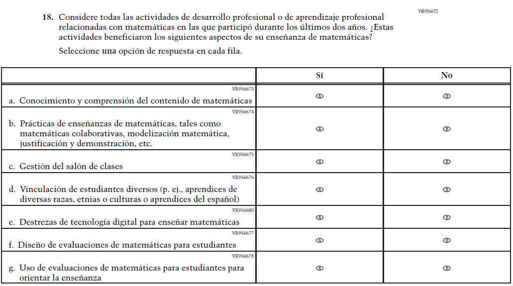 Appendix J-S provides Operational and Pilot Spanish student, teacher, and school survey questionnaires that will be administered in 2026. Summary tables reflect any changes to the items from the 2024 administration. Please note, some of the numbers of the items may be missing or out of order in these printed versions. This will be corrected in the platform view.