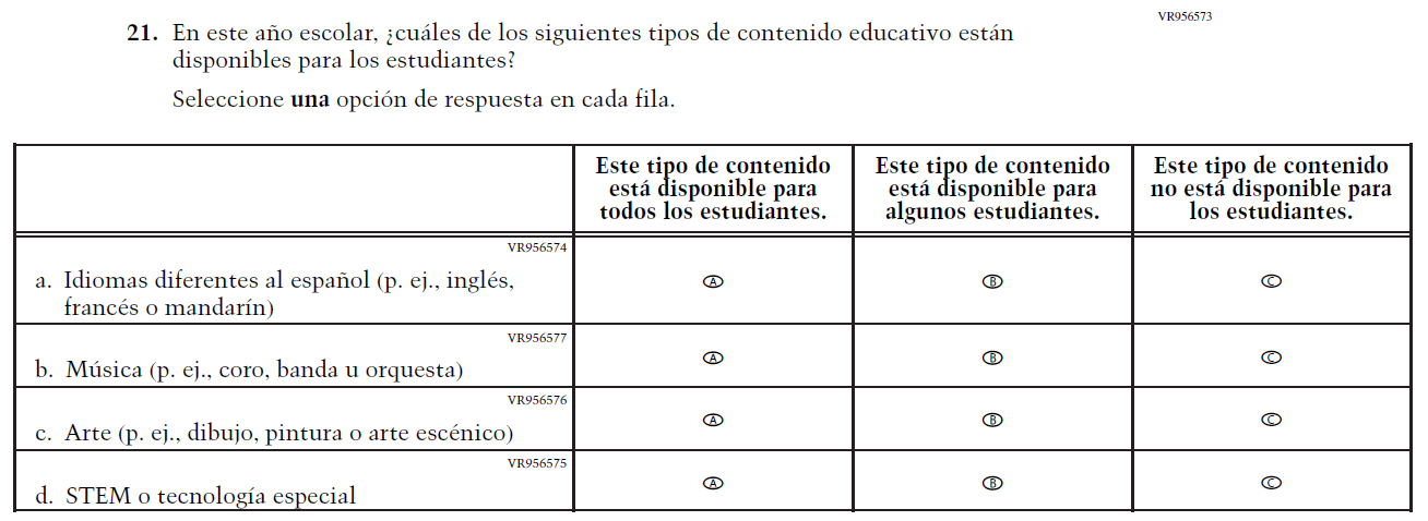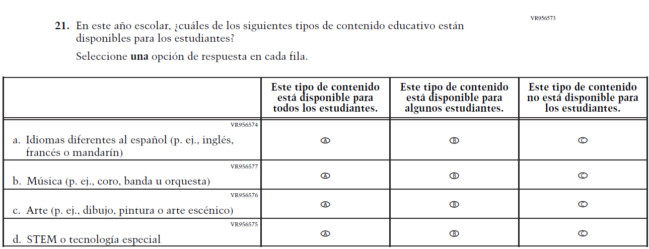 This Item was developed to measure students’ learning environments and access to educational content focused on languages, music, art, and STEM. |