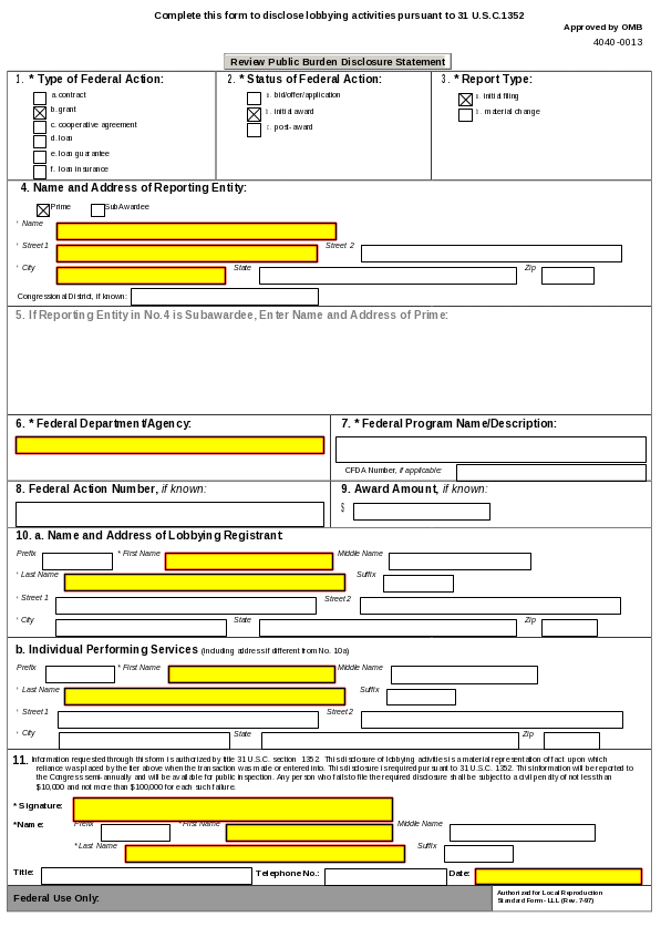 (2) If any funds other than Federal appropriated funds have been paid or will be paid to any person for influencing or attempting to influence an officer or employee of any agency, a Member of Congress, an officer or employee of Congress, or an employee of a Member of Congress in connection with this Federal contract, grant, loan, or cooperative agreement, the undersigned shall complete and submit Standard Form-LLL, ''Disclosure of Lobbying Activities,'' in accordance with its instructions.