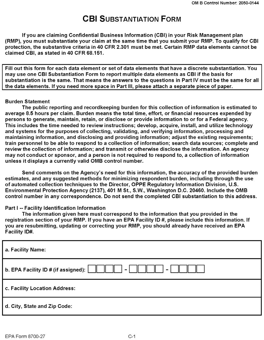 The annual public reporting and recordkeeping burden for this collection of information for those sources that claim CBI is estimated to average 9.5 hours per claim. This collection of information is approved by OMB under the Paperwork Reduction Act, 44 U.S.C. 3501 et seq. (OMB Control No. 2050-0144). Responses to this collection of information are mandatory (40 CFR 370.40 to 370.42). An agency may not conduct or sponsor, and a person is not required to, respond to a collection of information unless it displays a currently valid OMB control number. Form completion and mailing instructions can be found at https://www.epa.gov/rmp/rmpesubmit-users-manual. Send comments on the Agency's need for this information, the accuracy of the provided burden estimates, and any suggested methods for minimizing respondent burden, including through the use of automated collection techniques to the Director, Collection Strategies Division, U.S. Environmental Protection Agency (2822T), 1200 Pennsylvania Ave., NW, Washington, D.C. 20460. Include the OMB control number in any correspondence. Do not send the completed form to this address.
