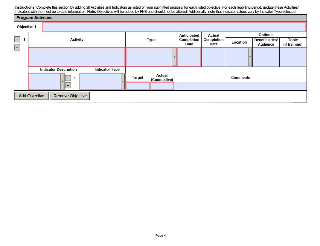 Note: In order to maintain consistency across FNS programs, use of the terms “objectives,” “activities” and “indicators” is required; no substitute words are allowed. the table to fill out the objectives specific to the program. Add rows as needed. An example is provided.>>
