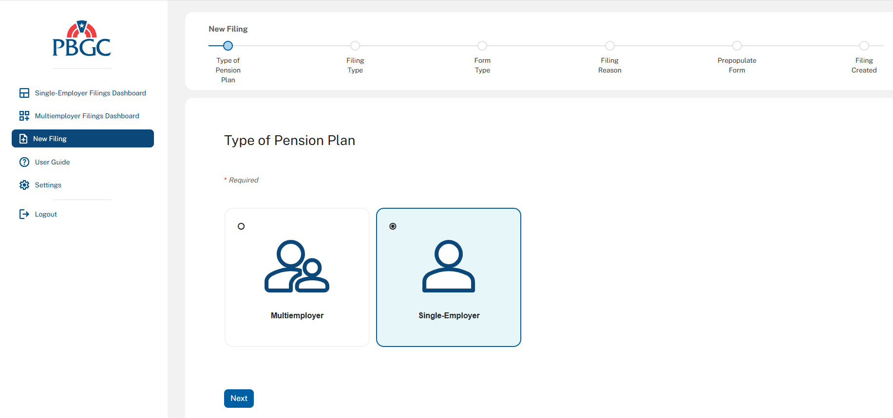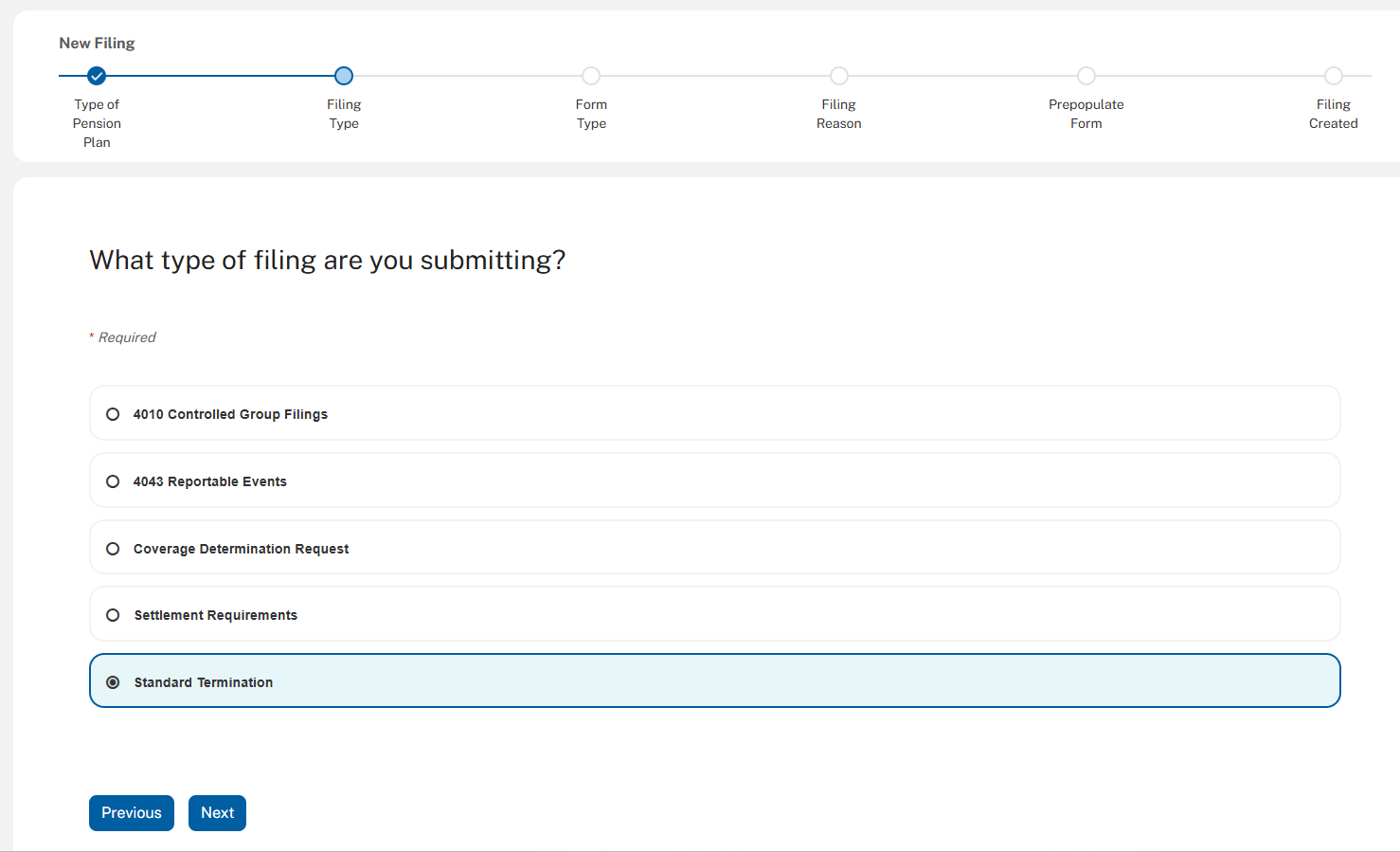 Currently, a plan must submit its standard termination filing by email. In the currently-approved instructions, there is language about PBGC’s e-Filing Portal becoming available in the future. The e-Filing Portal will be accepting standard termination filings beginning December 8, 2025. The information collected in the e-Filing Portal is the same as that collected on the PDF forms that are submitted via email.