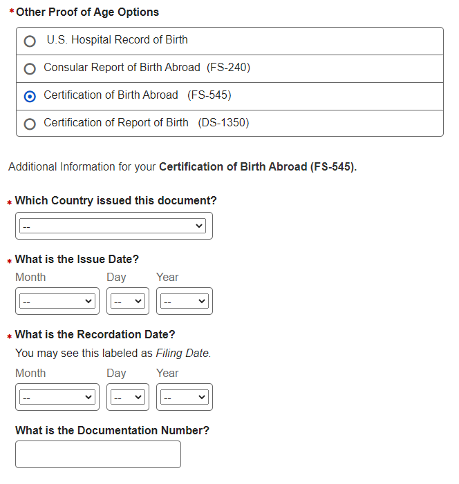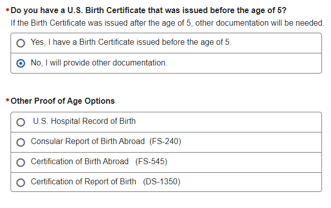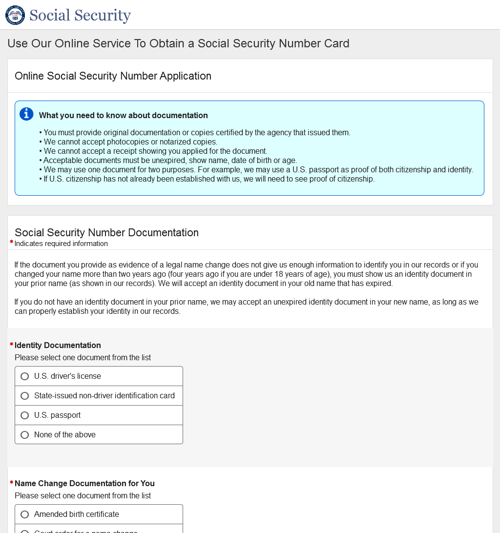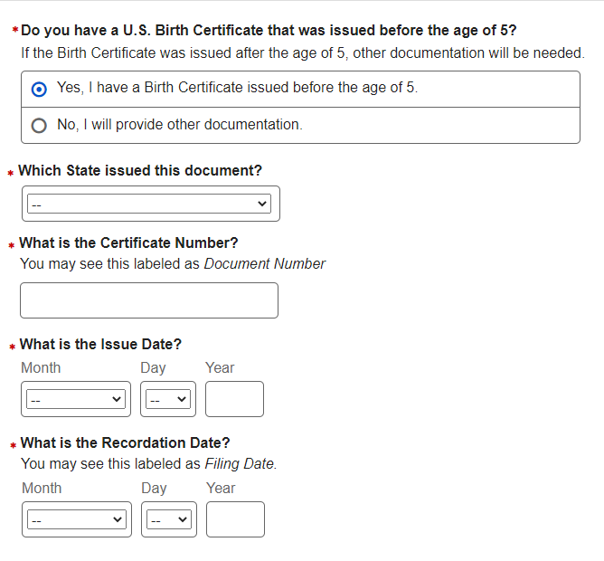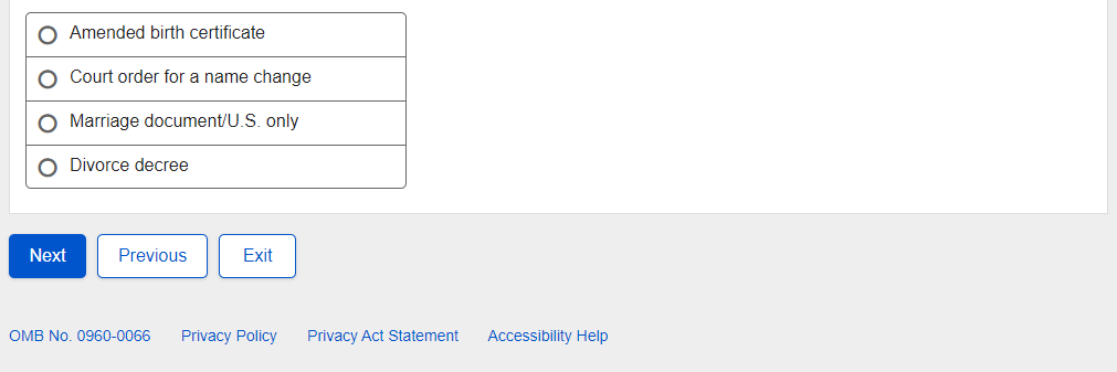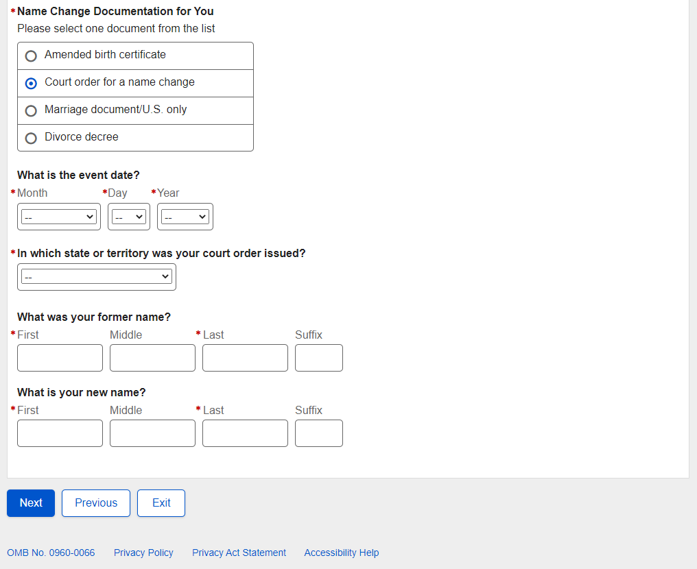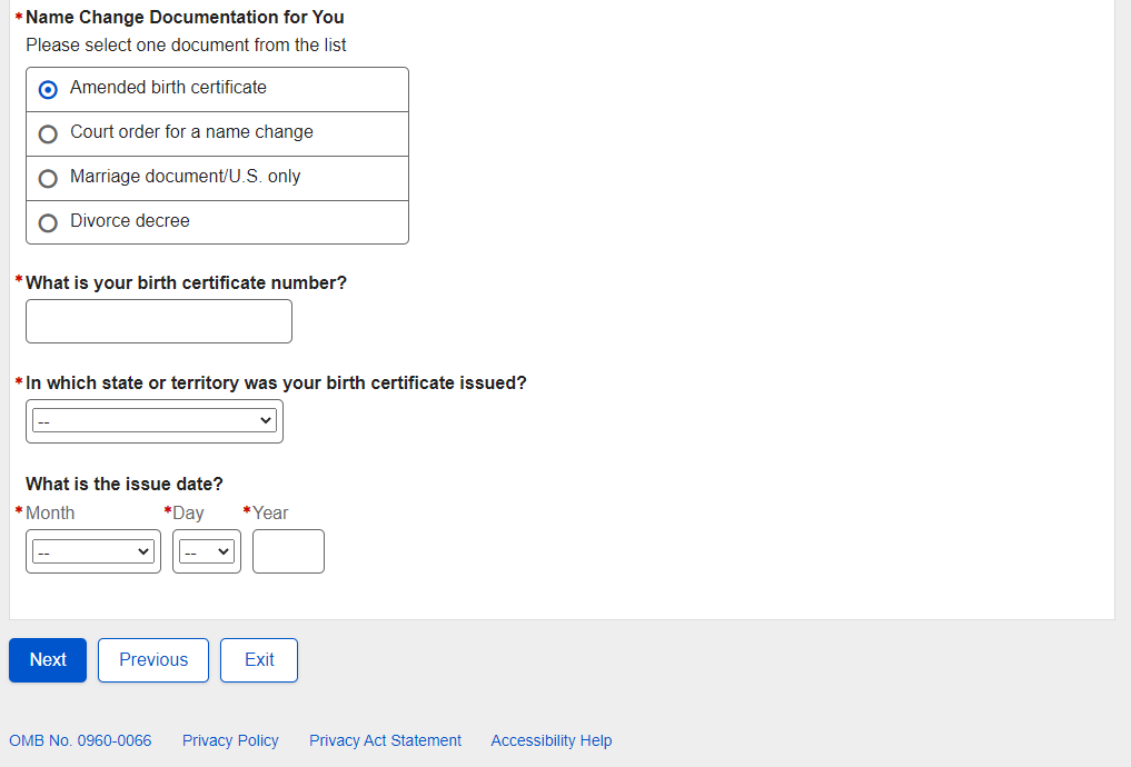 * In the Name Change Documentation for You field in the screenshot below, Amended Birth Certificate dynamic fields are the same in all paths and will not be shown in future paths.