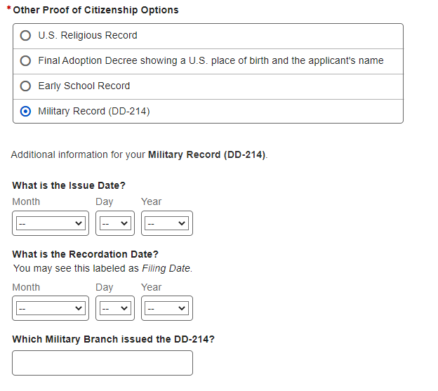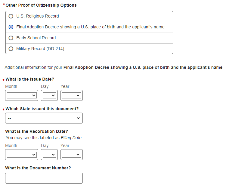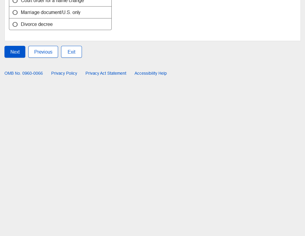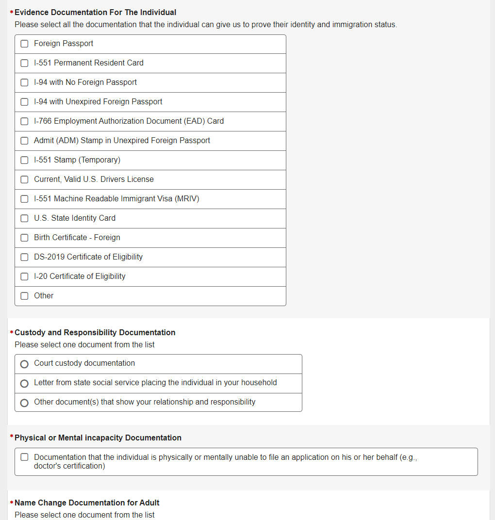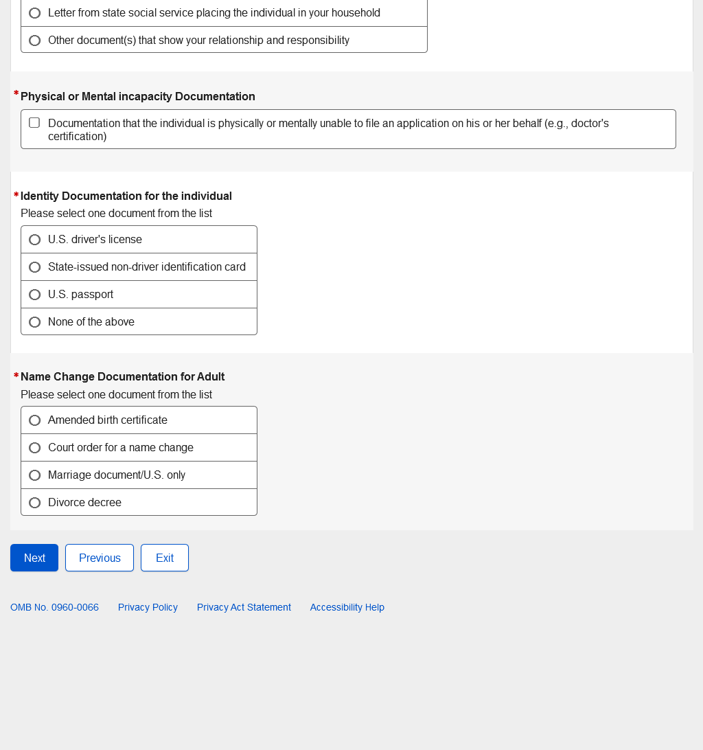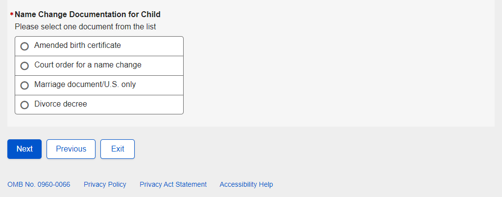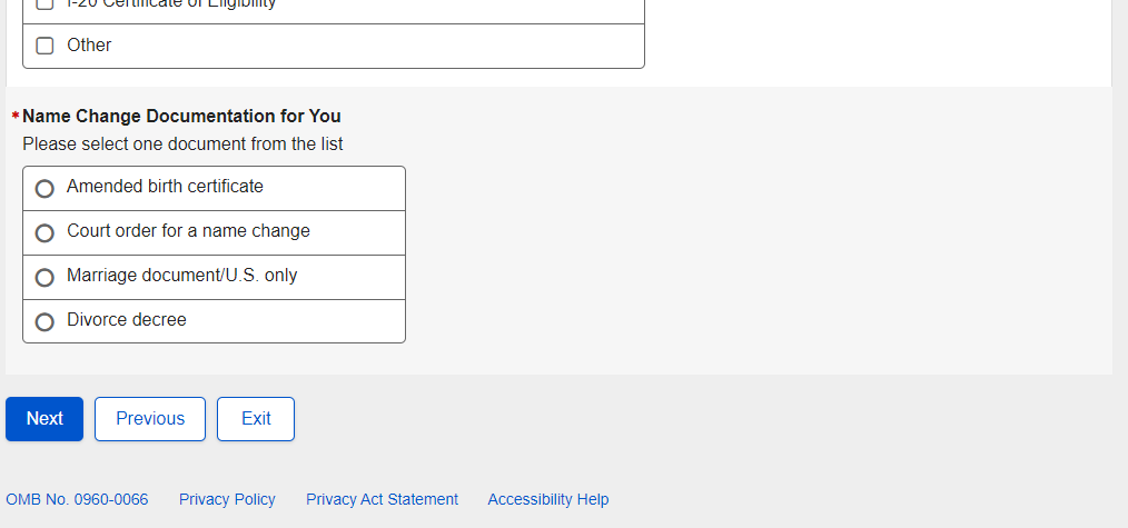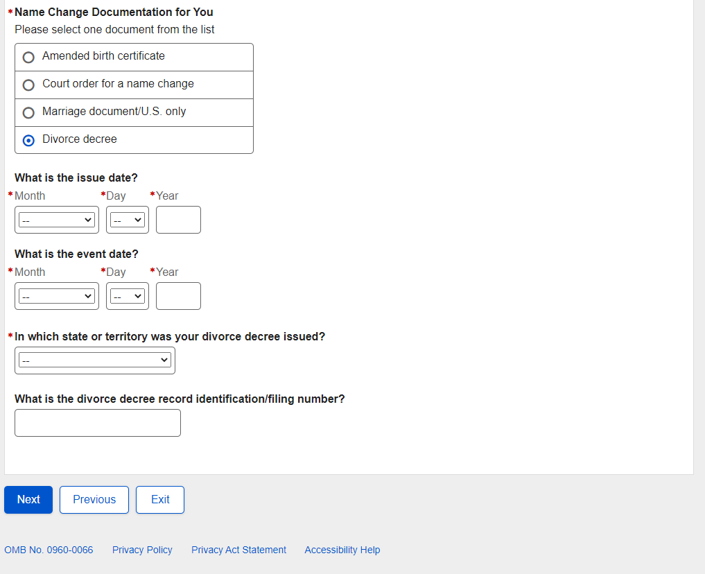 * In the Name Change Documentation for You field in the screenshot below, Divorce decree dynamic fields are the same in all paths and will not be shown in future paths.