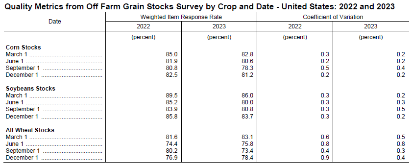The overall response rate for the four 2023 surveys is estimated at 70.0 percent. Quality metrics is documented in the publication “Grain Stocks Methodology and Quality Measures” report available at the link: https://www.nass.usda.gov/Publications/Methodology_and_Data_Quality/Grain_Stocks/02_2024/gsq0224.pdf.