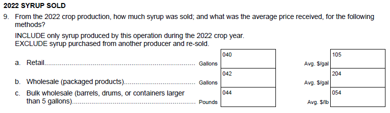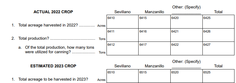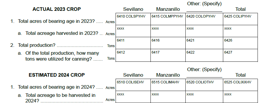 This change include some non-substantive changes for the 2024 Maple Syrup Inquiry based on the 2023 survey and the 2024 Table Olive Crop inquiry. The non-substantive changes are: