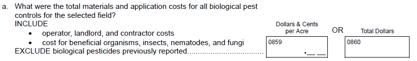 Question 16a – From: “What were the total materials and application costs for all biological pest controls for the selected field? INCLUDE operator, landlord, and contractor costs. INCLUDE cost for beneficial organisms, insects, nematodes, and fungi. EXCLUDE biological pesticides previously reported”
