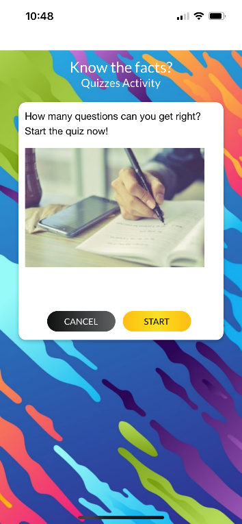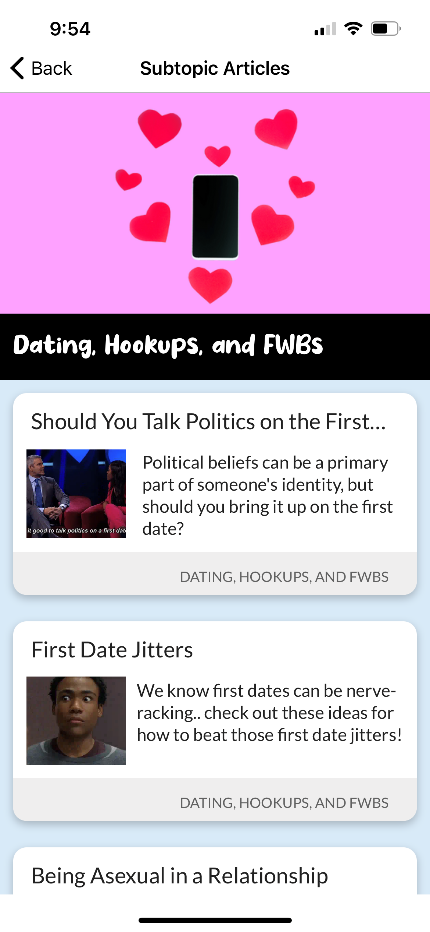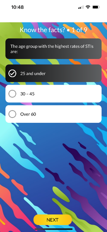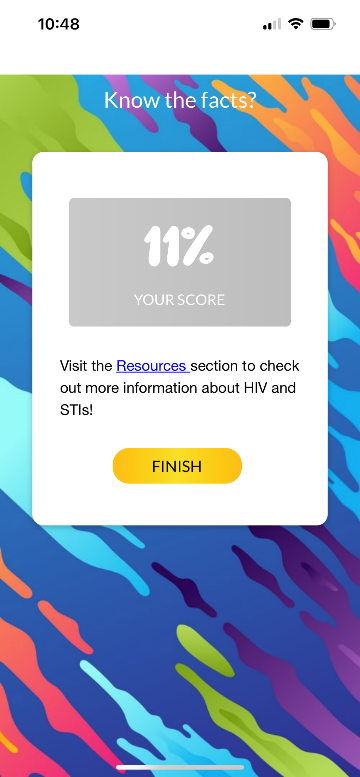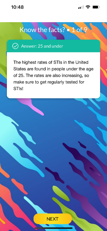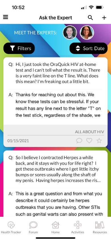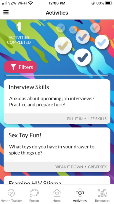 Users can access activities through the “Just for You” section on the home screen or at the bottom navigation bar. The “Just for You” section will pull a random activity from the published pool. There are seven types of activities: quizzes, assessments, choose-your-own-adventure, free text fill in the blank, sorting and categorizing drag and drop. Topic areas include HIV/STI prevention, creating change, love and relationships, health living, great sex, culture and current events and life skills.