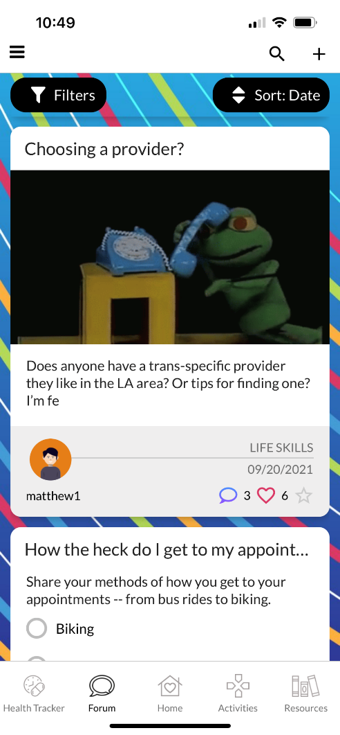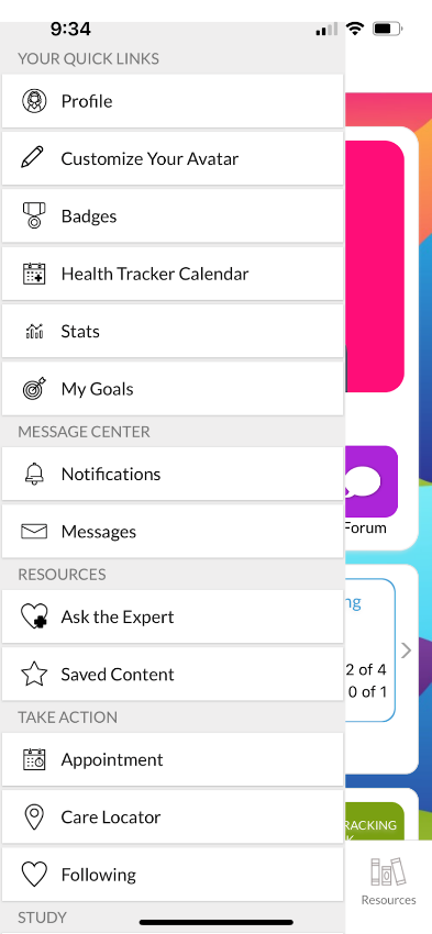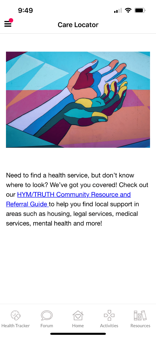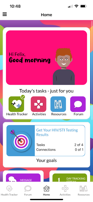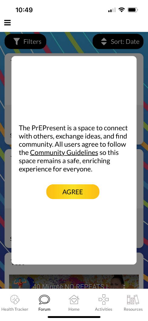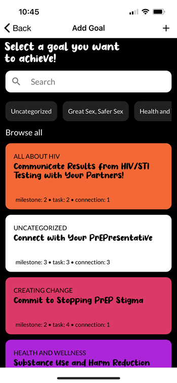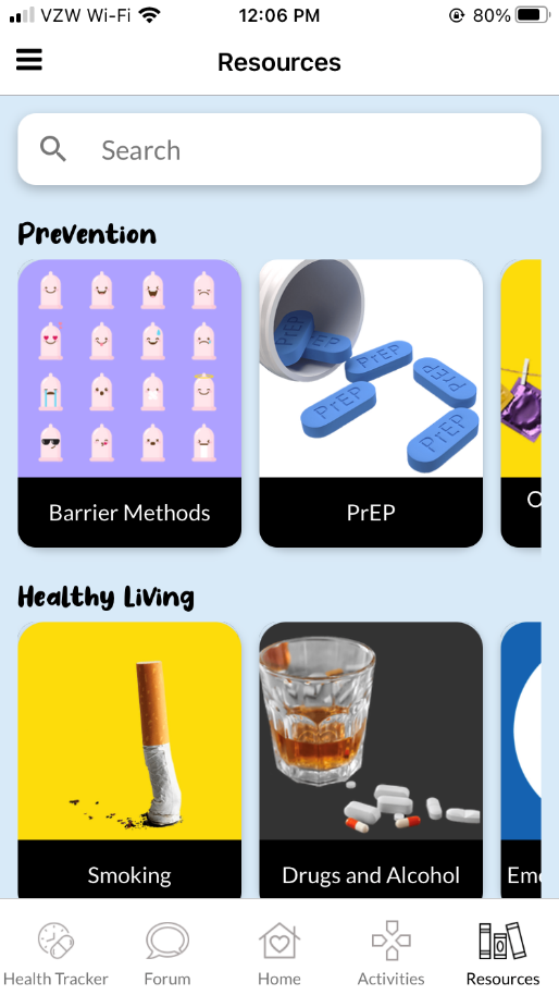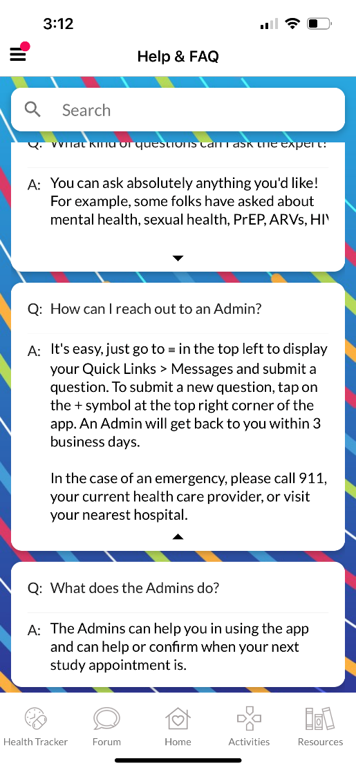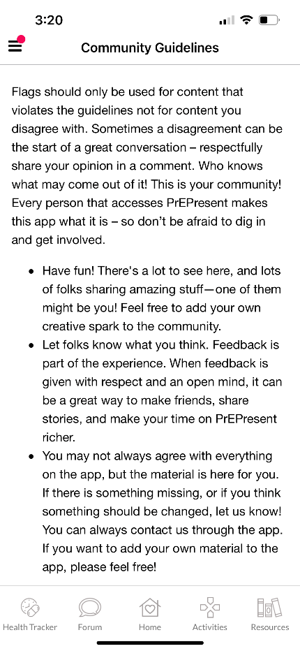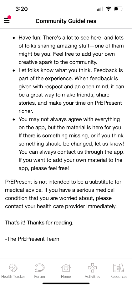 Resources: A knowledge center for participants to read articles and watch videos on a variety of health and wellness topics. Activities: Reinforce knowledge through interactive activities. Complete quizzes, fill-in-the blank, categorizing and choose-your-own-adventure activities, as well as set goals and complete health assessments Goal Setting: Participants select goals that they would like to achieve from a list of goals provided in the following categories: All About HIV, Health and Wellness, Life Skills, Great Sex/Safer Sex, Creating Change, and Uncategorized. Milestones, tasks, connections, tips, a journey area and suggested next goals are provided for each goal to help participants achieve it. This section also allows participants to run through a curriculum that keeps them on target with their chosen health and wellness goals. Forum: A space for participants to voluntarily engage in group conversation. Includes ability to post, comment, like and save content, as well as participate in polls created by staff. This section is like a social media newsfeed. Ask the Expert: Allow participants to send anonymous health and wellness questions to a medical expert. Questions are submitted anonymously; answers are displayed for all to see. Care Locator: Find resources based off location or services needed from a pre-developed directory or website (e.g., hiv.gov for finding testing locations) Help & FAQ: Participants can find commonly asked questions and answers related to the app and study. Community Guidelines: Participants can read about guidelines the study enforces around inclusive and respectful behavior on the app. Consent: Participants can review the informed consent document they signed upon enrolling in the study. This document explains key components of the study and any potential benefits and risks they may experience from being in the study.