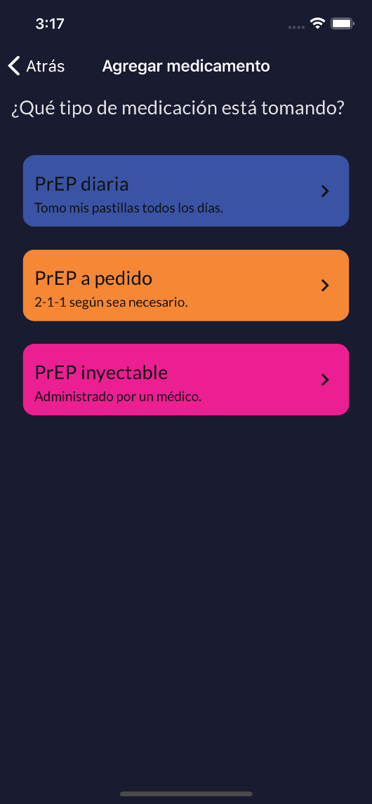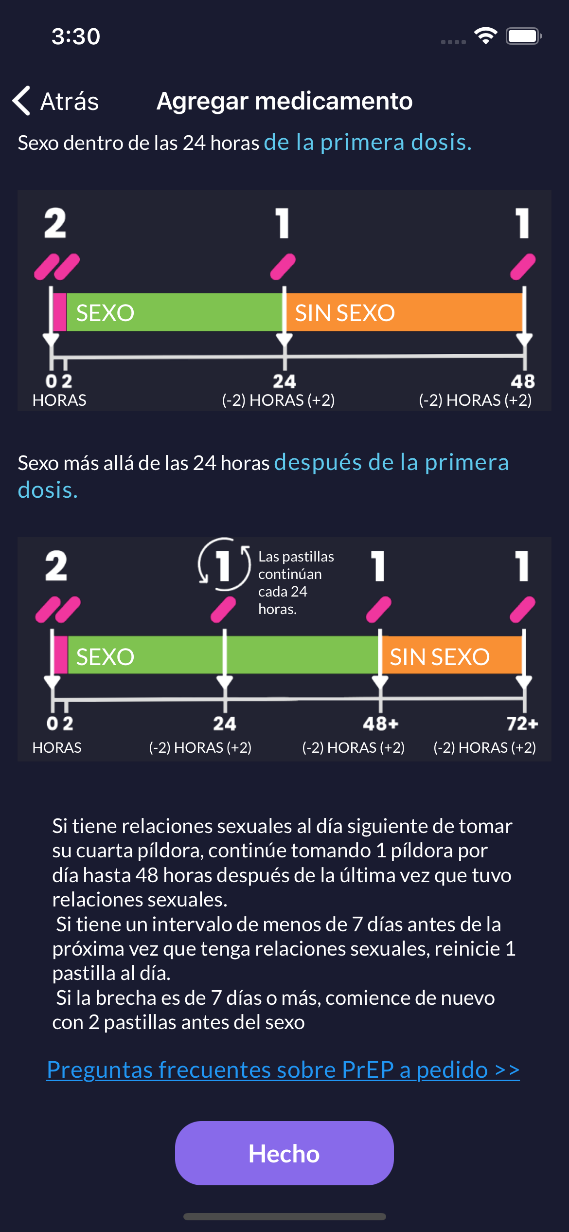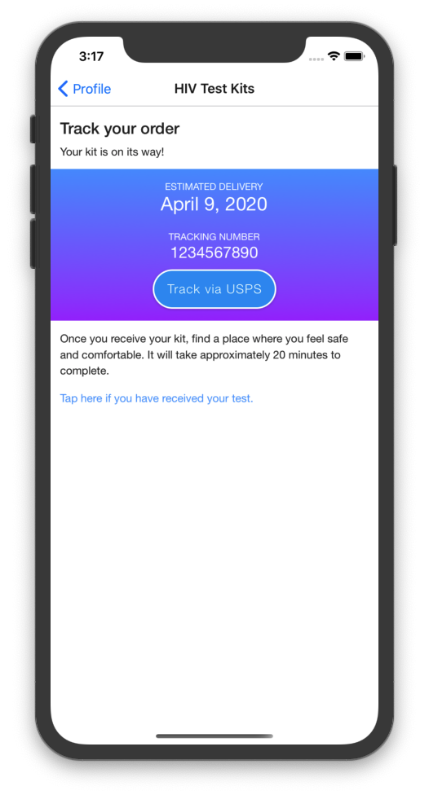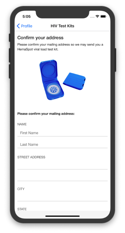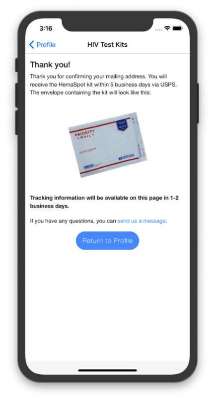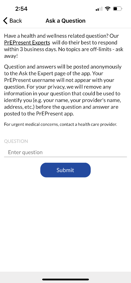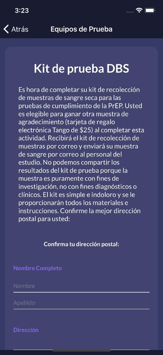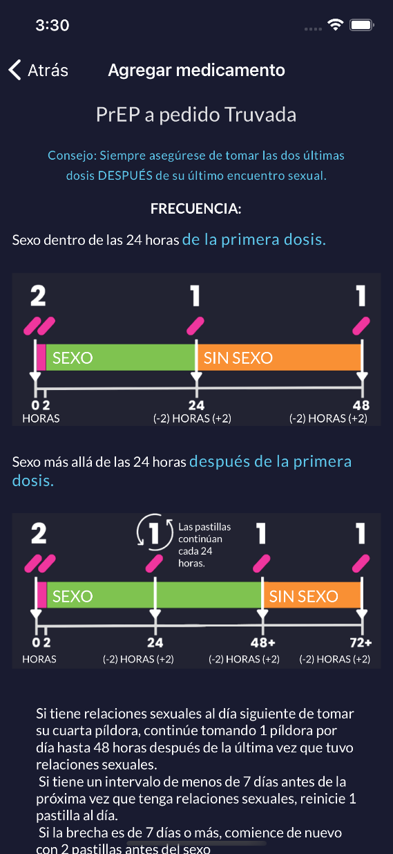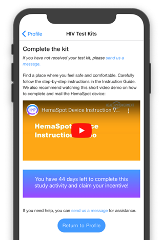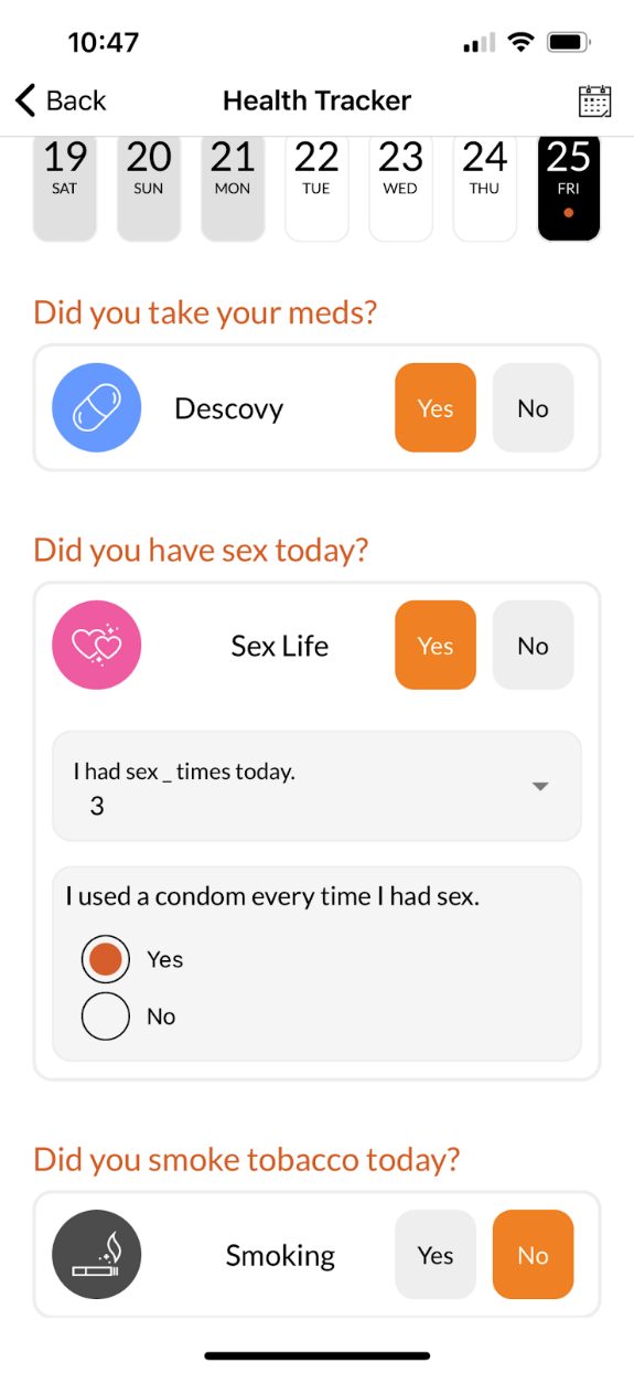 Medication (PrEP) Tracker Setup: This section helps participants remember to take their medication. Participants can link reminders to daily actions, such as brushing their teeth, customize text in the reminders to ensure discreetness, track their medication, and view patterns and analytics. Use of the medication tracker is optional but recommended after the initial app setup. Health (Sex) Tracker Setup: This section helps participants recognize how their sexual habits may impact what type of PrEP form suits them best given their activity (e.g., start dating and having sex more regularly, then they can move from on demand PrEP to daily PrEP). Participants can also choose to track other behaviors that may influence PrEP adherence, such as smoking, alcohol and mood. Participants can track their sexual activity and other health behaviors, view patterns and analytics. Use of the health tracker is optional but recommended after the initial app setup. DBS Test Kit: Within the study, participants are sent dried blood spot collection kits to predict and measure adherence rates to PrEP. Participants can use this page to find their kit’s USPS tracking information for up-to-date notifications around delivery. They can also view an instructional video on how to complete the DBS kit.