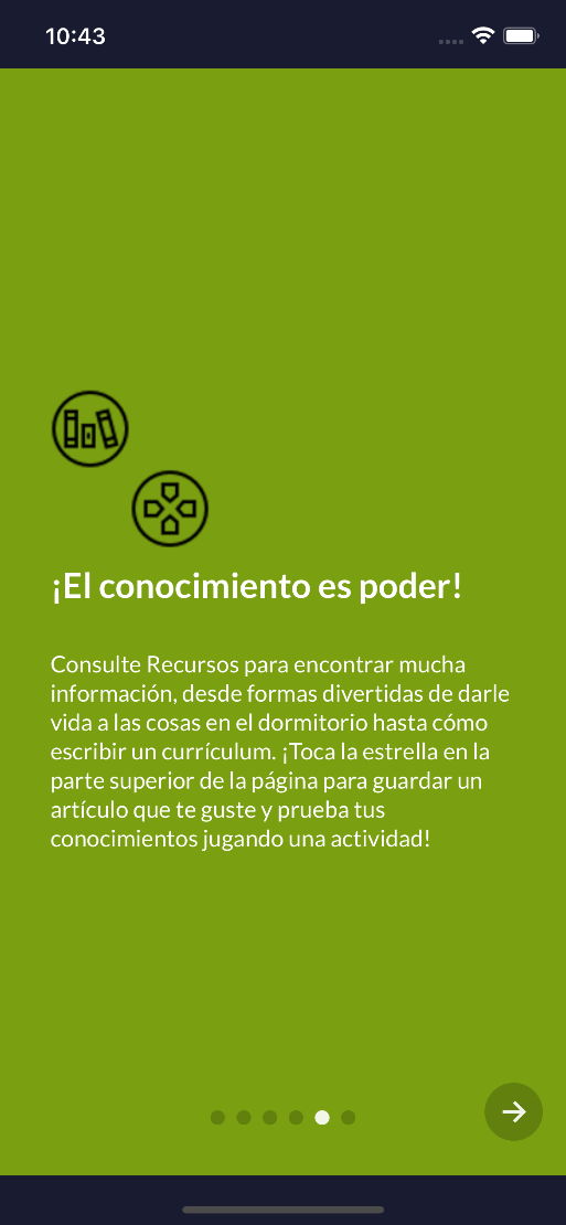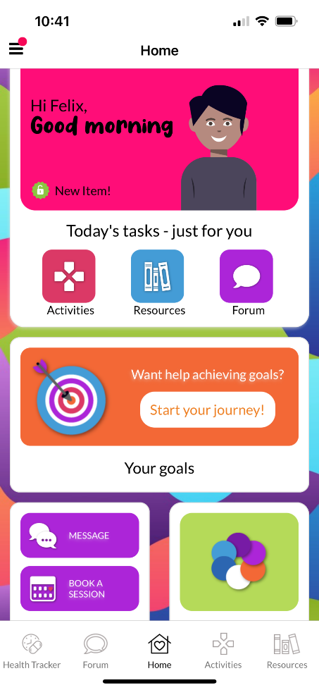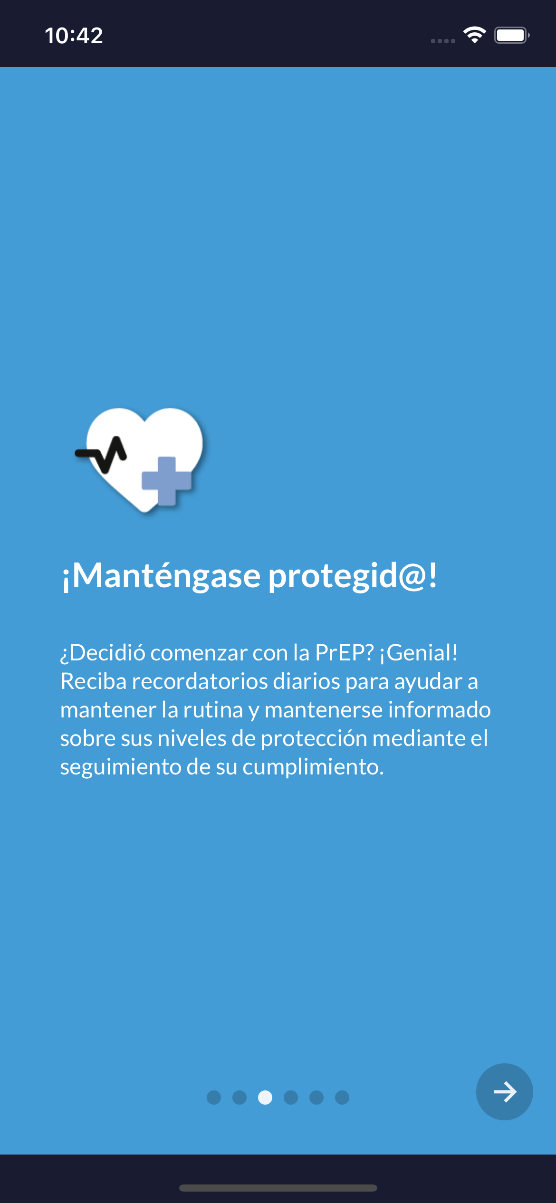 The user will then be prompted to tap through the app orientation screens, introducing them to key features including their care navigator, the medication and sexual activity tracker, forum, resources, activities, goals and how to customize their avatar.