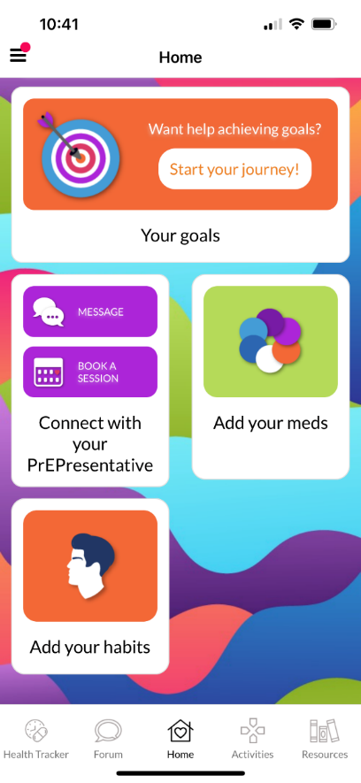 After tapping through the orientation screens, the user will land on the home screen. Here users are prompted to add medication, sexual activity, and other habits. The screen also provides easy navigation to setting goals, customizing their avatar, scheduling an appointment with the care navigator, completing activities, reading articles, and connecting with others in the forum.