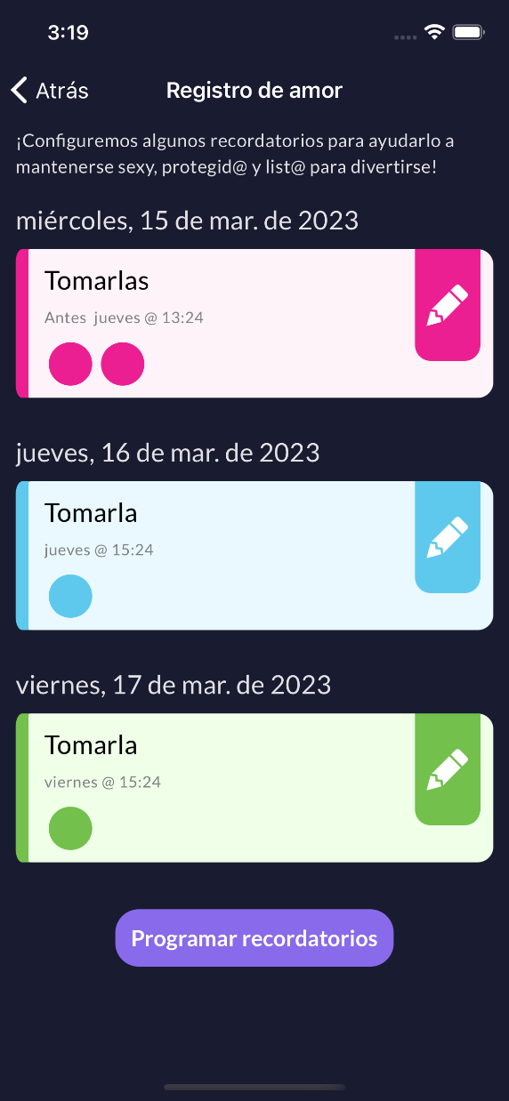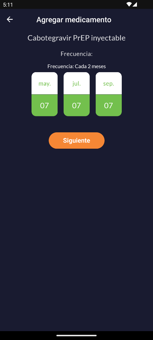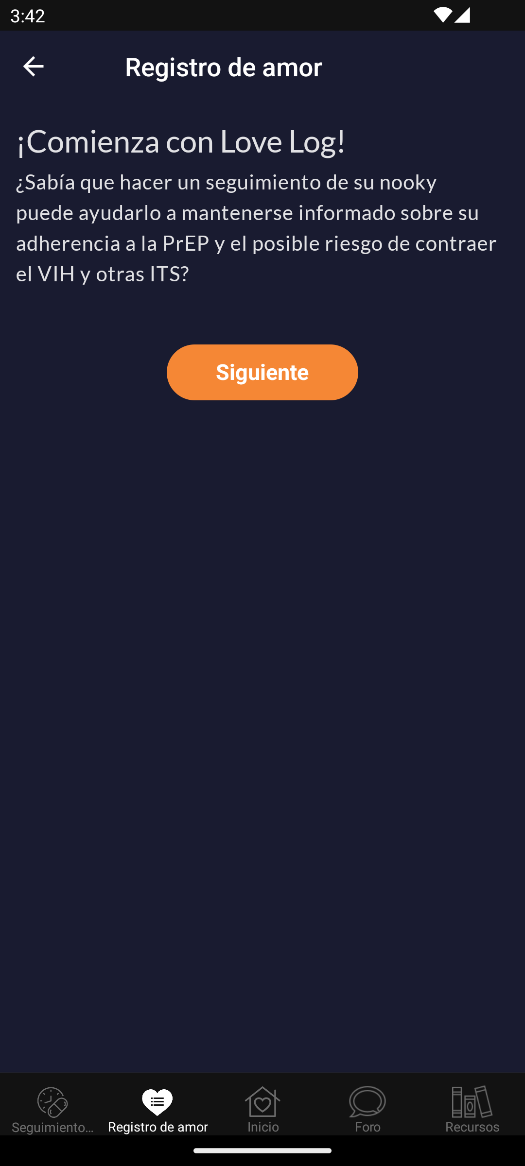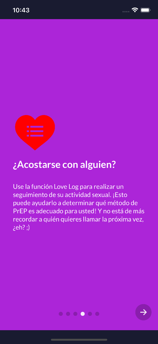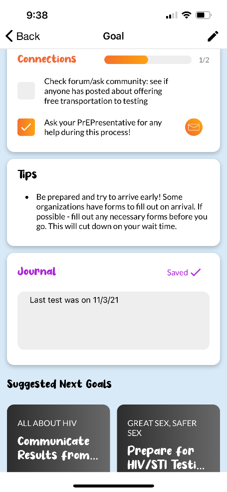 From the home screen or main health tracker screen, users can set up and track their sexual activity. Tracking their sexual activity, and other habits if they so choose, can help users recognize patterns within their medication adherence and identify factors that may influence how adherent they are over time. It can also help them recognize if a different method of PrEP might be better suited for them given their activity. E.g., if a user is not having very much sex, they might opt for on demand PrEP instead of daily PrEP.