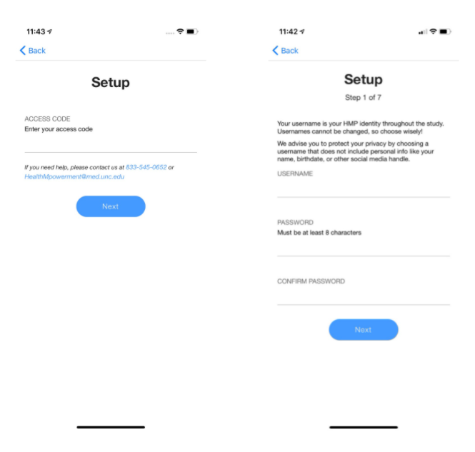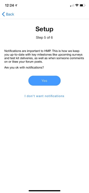 Upon receiving the enrollment email, a user will download the app from the Apple or Play Store and select “Sign Up”. Using the unique access code provided in the email, a user can then create a username and password for their time in the study. They are encouraged to protect their privacy and choose a username that will ensure anonymity. Next, the user will be prompted to choose a PIN, confirm said PIN, enter in their mailing address for future DBS kits, and provide an email and phone number. The last step in the sign-up process is enabling notifications. This will allow the app to send push notifications for key events, such as survey availability or new content being released.