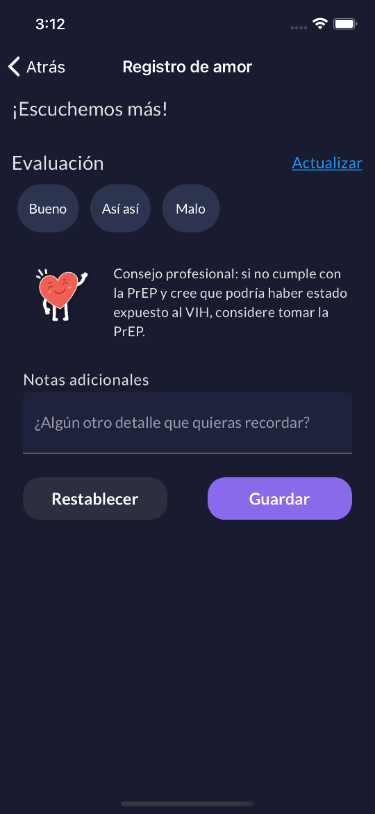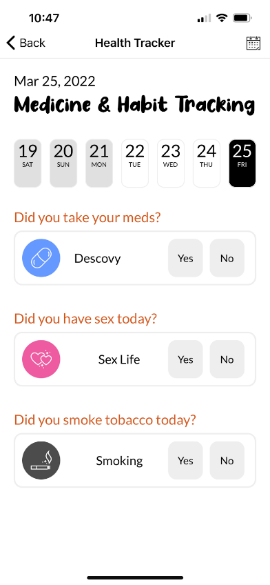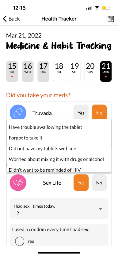 From the home screen or main health tracker screen, users can track their sexual activity. Tracking their sexual activity, and other habits if they so choose, can help users recognize patterns within their medication adherence and identify factors that may influence how adherent they are over time. It can also help them recognize if a different method of PrEP might be better suited for them given their activity. E.g., if a user is not having very much sex, they might opt for on demand PrEP instead of daily PrEP.