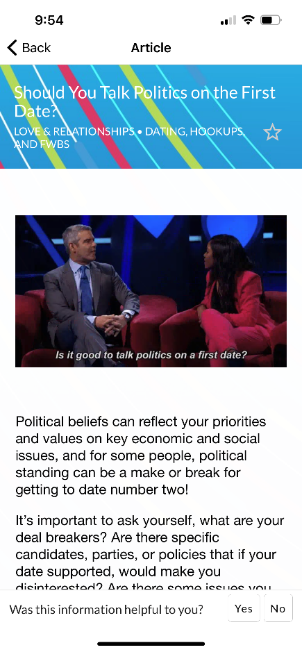 If the user taps on the “Resources” button in the “Just for You” section, the app will take them to a randomly selected article. The user can save the article by selecting the star at the top right, as well as mark “yes” or “no” to the question “Was this information helpful to you?” Users can also access resources through the bottom navigation bar.