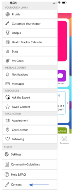 Participants will complete the informed consent process outside of the app; however, they will be able to view a copy of the consent form within the app. Accessing and viewing a copy of the consent form is not a mandatory action for participants within the app, but it is always available to participants. Any modifications or updates submitted to the IRB are updated within the app as well. This update does not require users to update their mobile devices but happens automatically ensuring they always have access to the most current version. Users can access this page via the slide out menu.