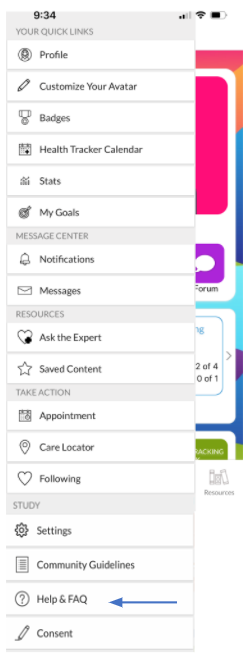 Users can access commonly asked questions about the study and app from the slide out menu.