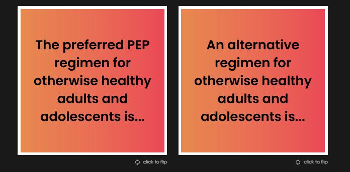 We also use flip cards throughout the modules as a way for providers to actively engage with the content rather than reading text on a screen. Providers are encouraged to click on the card to flip it for more information on that topic. The screenshots below show the front and back of a set of flip cards on PEP regimens.