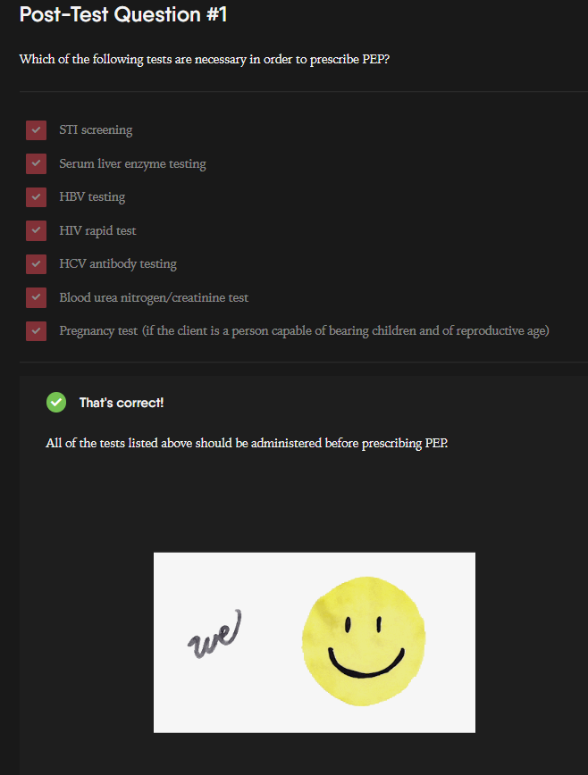 In this module, we provide an overview of Post-Exposure Prophylaxis (PEP) in contrast to PrEP and how to screen and prescribe PEP. In several sections, we include post-test questions to help providers understand what they learned in that module. Below we highlight an example of a check all that apply question.