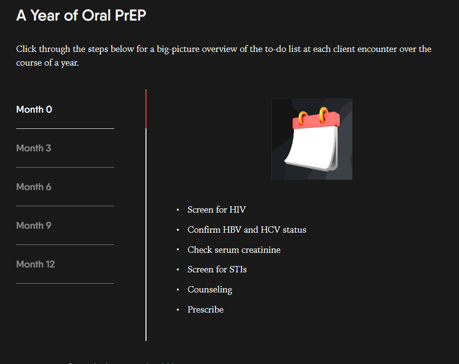 This module provides an overview of the different oral PrEP regimens available and considerations for providers when prescribing these different regimens. An interactive element used in this module allows providers to click on a month to generate a to-do list for providers when seeing a client for that month.