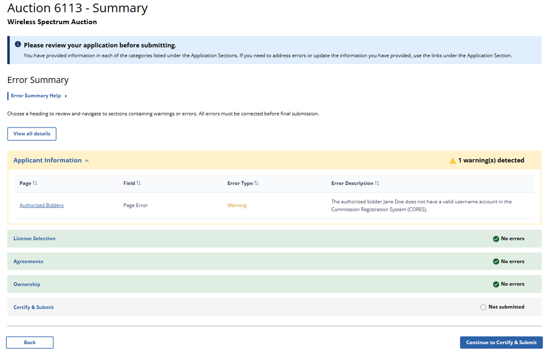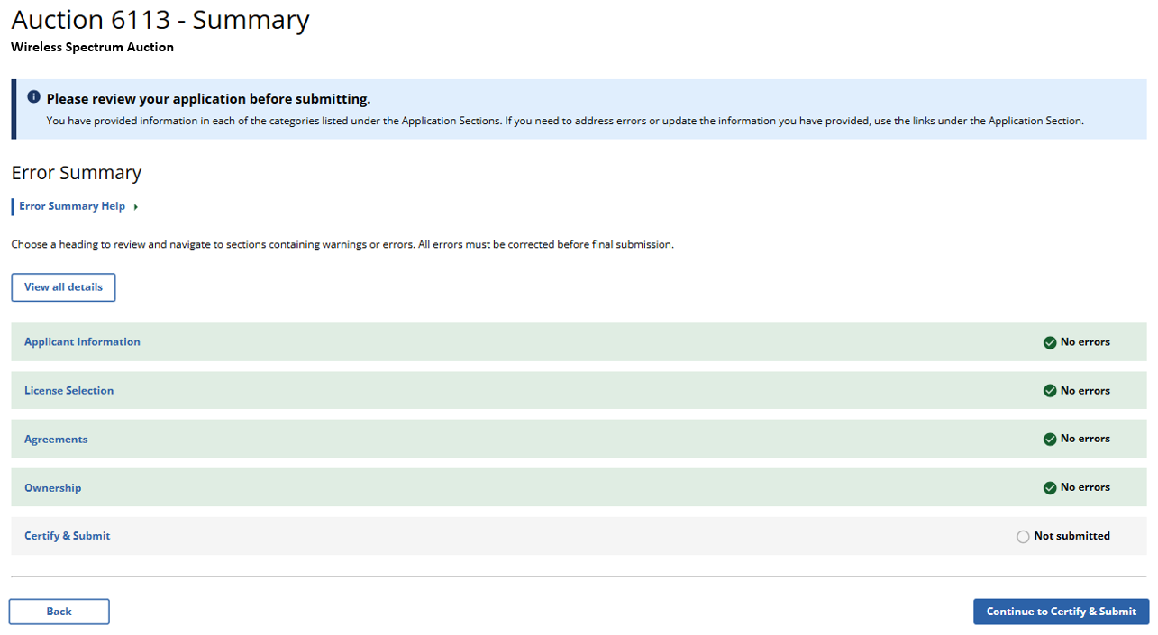 (Error Summary With No Errors Detected as Displayed to Wireless Auction Applicants)