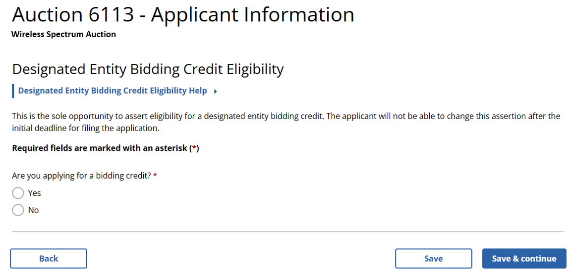 (Displayed Only to Wireless Auction Applicants Seeking a Small Business Bidding Credit or a Rural Service Provider Bidding Credit)