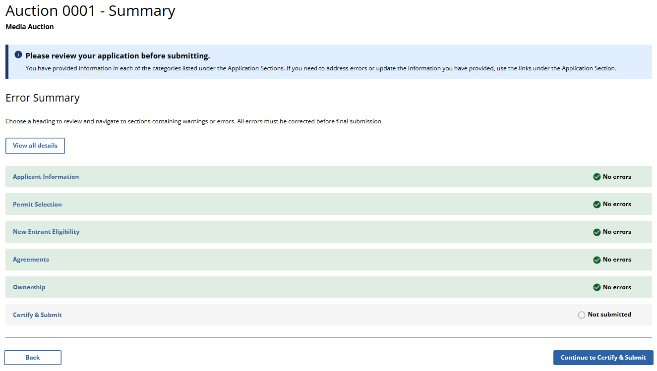 (Error Summary With No Errors Detected as Displayed to Broadcast Non-Table Service Auction Applicants)